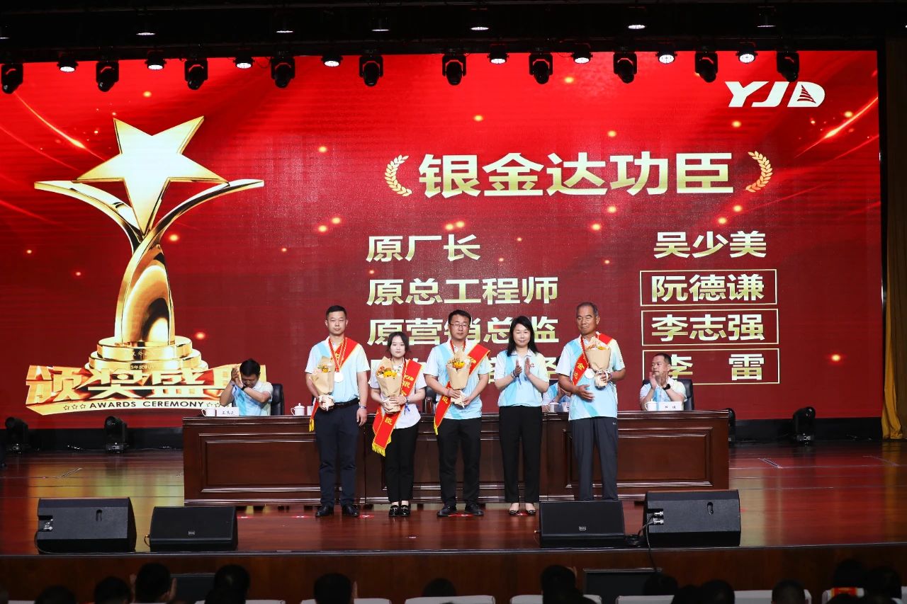 資深員工表彰環節溫情涌動。37名十年資深員工、20名二十年資深員工以及三十年資深員工郜貴堂依次登臺,他們用十年、二十年、三十年的堅守,詮釋了與企業風雨同舟的深厚情誼。吳少美、阮德謙、李志強、李雷四位“銀金達獎”獲得者的事跡更是感人至深。創業元老吳少美在初創期挺身而出奠定根基;產業鏈總設計師阮德謙勾勒產業版圖;銷售鐵軍李志強將訂單化作騰飛羽翼,開拓了大客戶群體;外貿功臣李雷讓銀金達品牌走向世界。他們的奉獻精神如星辰閃耀,照亮銀金達前行之路。鮮花與喝彩,獻給所有以堅守為筆、以奮斗為墨,書寫企業華章的時光筑夢人。