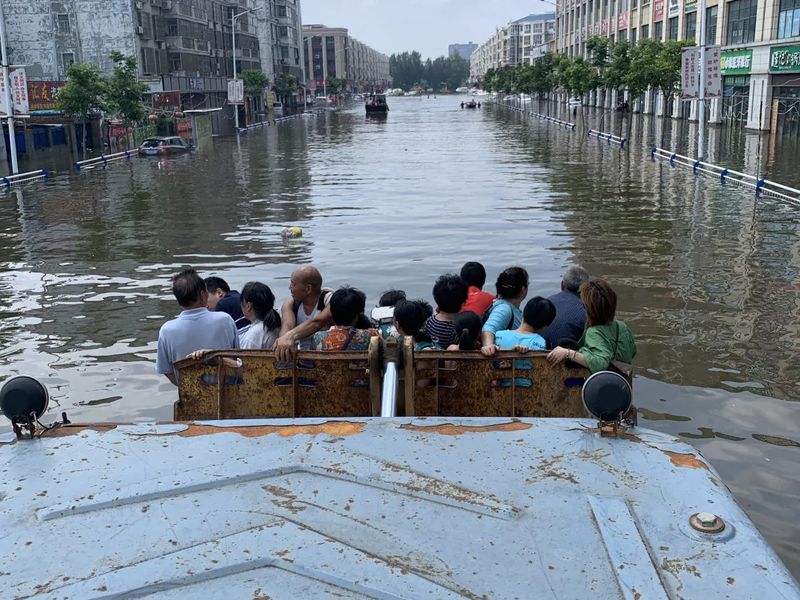 3、李沅鴻領隊12人出動2輛鏟車、2艘橡皮船、2輛班車、1輛集裝箱車水中救援職工及其家屬和受災群眾,運送至銀金達安置點,并參加李良屯護堤防汛;